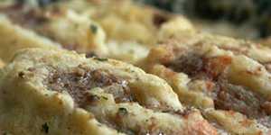 На рабочей поверхности, посыпанной молотыми сухарями, из картофельного теста руками сформировать пласт. На него равномерно выложить мясной фарш, смешанный с яйцом и приправами.