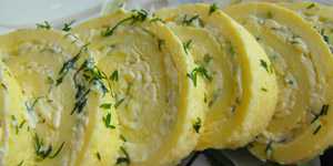 Аккуратно сворачиваем рулетом, заворачиваем в пищевую пленку и отправляем в холодильник. Можно сверху посыпать нарезанной зеленью или еще как-нибудь украсить.