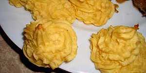 Потом берем мешок (которым делаем цветочки на тортах) со звездообразной насадкой. Заполняем мешок картофелем и выдавливаем на противень цветочки. При желании цветочки сверху можно смазать желтком.