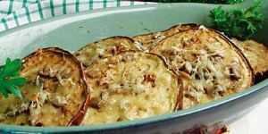 Обжарьте баклажаны в разогретом масле до золотистой корочки, разложите на противень, посыпьте тертым сыром и запекайте в духовке несколько минут, пока сыр не расплавится. Подайте сразу, оформив веточкой зелени.