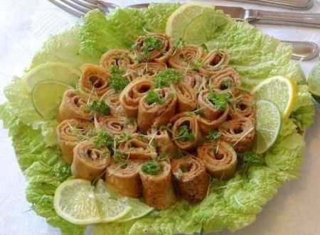 Для приготовления закуски понадобятся консервы печень трески в масле, яйца, соль, перец черный молотый, чеснок . Разбить яйца, добавить соль и перец. Взбить, добавить масло. 1/3 вылить на разогретую сковороду, поджарить блины с двух сторон. Обжаривать до золотистого цвета. Выложить на тарелку и накрыть полотенцем, чтобы был мягким и не завитрився, пока жарятся прочие блины. Каждый блин натереть долькой чеснока. Распределить по поверхности блинчика 2 ст. л. печени трески и свернуть рулетом. Порезать на кусочки и подать к столу.