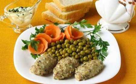 Петрушку вымыть в проточной воде, обсушить и очень мелко порубить. В фарш положить размягченный маргарин, яйцо, рубленую зелень, перец, соль и влить бульон. Массу тщательно перемешать до однородности и поставить на 1 час в холодильник. Из фарша скатать небольшие колбаски и разложить их на решетке пароварки. Пароварку закрыть крышкой и варить изделия в течение 1 часа. Подать с соусом и зеленым горошком. К холодным колбаскам подойдет соус - хрен, а к горячим - томатный.
