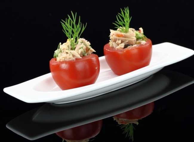 Наполнить половинки томатов фаршем, выложить их на блюдо. Поверх нанести небольшое количество соуса.
