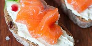 Хлеб нарезать ломтиками, смазать сыром. Выложить ломтики рыбы, украсить огурцом и зернами граната.