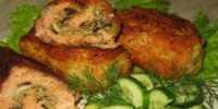 Сверху посыпать тертым сыром. Скатать рулетом от широкой части к хвостовой, заколов шпажкой. Так же проделать и с другими кусочками филе. Получилось три рулета: один из кеты и два из щуки. Теперь приступим к жарке. Для этого каждый рулет сначала обваливаем в муке, потом макаем в яйца, затем в панировочные сухари.