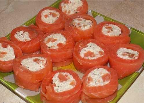 Разложите на столе пищевую пленку или бумагу для выпечки (лучше несколько слоев, внахлест) и выложите на нее ломтики рыбы тоже внахлест (чтобы один кусочек заходил на половинку другого). Затем на рыбу выложите начинку и с помощью бумаги или пленки скатайте рыбу рулетом. Положите его на час в холодильник, чтобы рулет немного подмерз и его удобно было нарезать. При подаче разрежьте его острым тонким ножом на роллы.