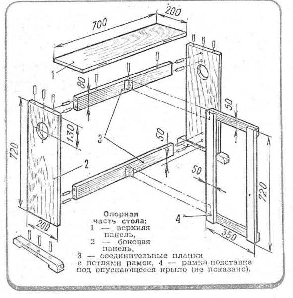 В небольшой комнате обеденный стол нормальных размеров - уже помеха. Значительно удобнее, если в нерабочем положении его поверхность можно было бы уменьшать, скажем, складывая до размеров узкой тумбочки, занимающей совсем немного места у стены. Средняя часть - опорная: к ней крепятся опускающиеся крылья и рамки-подставки.