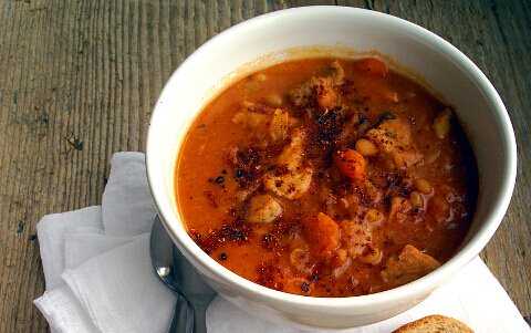 Продукты: 0,5 кг белой фасоли, 600 г свинины, 1 большой красный перец, 2 головки репчатого лука, 3-4 зубчика чеснока, 3-4 моркови, 2-3 помидора или 2 столовые ложки томатной пасты, 3 столовые ложки масла, соль, паприка, мята, петрушка.