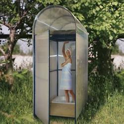 Вы будете использовать летний душ на даче днем и поздно ночью. Обеспечьте освещение круглосуточно. Для естественного освещения сделайте окно в верхней части двери или боковой стены. Оно может быть застеклено прозрачным стеклом. Если душ только летом, оставьте его без крыши, это улучшит естественное освещение кабины и вызовет приток свежего воздуха.