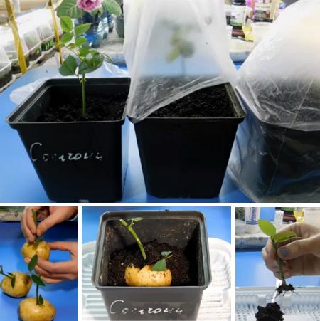 Еще один интересный способ – укоренение черенков в картофеле. Отцветшую из букета розу делим на 3 черенка, с двумя междоузльями. Нижняя часть черенка должна быть длиной, примерно на 1 см от листа (почки). Листовые пластины также удаляем, оставляя по одному листочку. Таким образом, черенку будет легче укореняться. Берем картофель, если клубни старые, тогда все ростки необходимо удалить с помощью ножа. В картофеле проделываем отверстие, макаем черенок сначала в воду, затем в корневин (стимулятор роста корней) и только потом помещаем его в картофельное отверстие. Далее картофель с черенком помещаем в контейнер с грунтом, засыпаем клубень землей, поливаем его и с помощью пакета создаем тепличку. Отправляем контейнер в светлое, теплое местечко, где свет рассеянный. Через полтора месяца, должна образоваться хорошая корневая система.