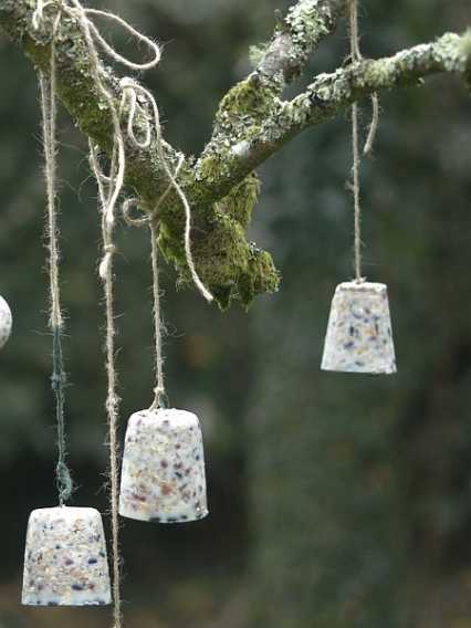 Растопите жир на слабом огне, смешайте его с зерном и выложите массу в подготовленные формочки, на дно которых предварительно поместите скрученную колечком проволочку, к которой привязана нитка — за нее вы и повесите корм на дерево.