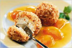 Ингредиенты: мороженое-полено — 1 кг или любое другое мороженое, яйца, кокосовая стружка, панировочные сухари.