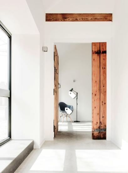 В современном пространстве выбирайте двери с каким-то характером. Этот деревянный дизайн добавляет деревенский вид в современную, белую комнату.