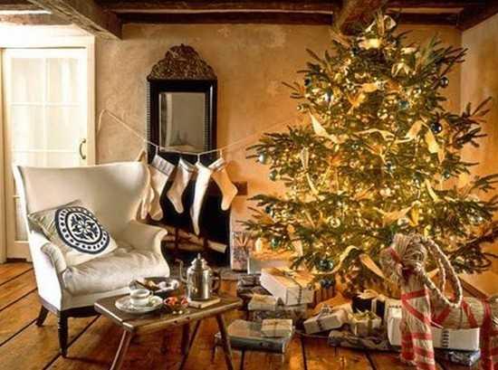 А если камина нет, то пусть важнейшей деталью интерьера станет украшенная елка.