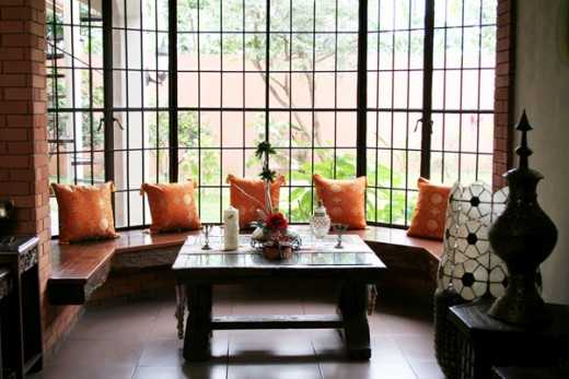 Если окна эркера довольно низки, то можно сделать широкий подоконник и устроить на нем место для отдыха. Для этого достаточно сшить по размеру подоконника подушку с использованием поролона (как сидение для дивана). Также можно добавить несколько маленьких подушек, чтобы подкладывать под спину.