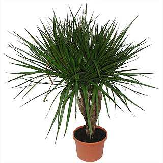 Драцена. Его также называют "драконовым деревом". По самым скромным подсчетам сейчас насчитывается не менее 40 видов драцен. Комнатные драцены могут вырасти до 3-х метров, а их дикорастущие родственники - до 20 метров в высоту. Драцены неприхотливы, только плохо переносят сухой воздух. Для них более благоприятна повышенная влажность, поэтому растение нужно регулярно опрыскивать и периодически устраивать теплый душ. Летом полив должен быть более обильным, чем зимой. Но не допускайте застоя воды в горшке. Лучше если температура в комнате, где растет драцена, будет не ниже +16 °С. Не стоит ставить ее на сквозняке. Лучше поставить растение на свету, но так, чтобы на него не попадали прямые солнечные лучи. Драцена нейтрализует большое количество формальдегида, бензола, ксилола.