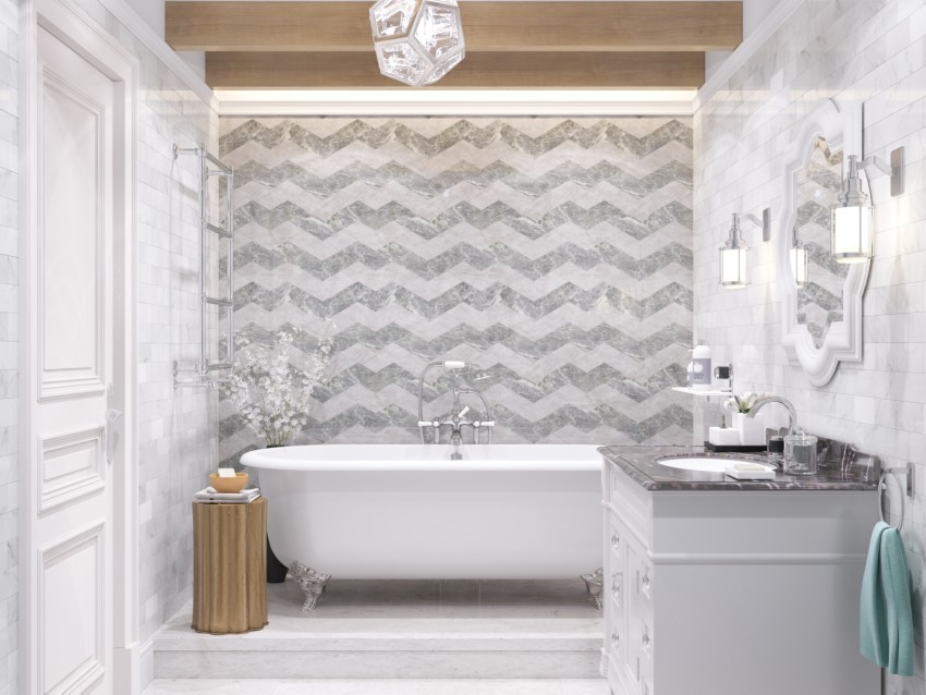 Можно сочетать плитку с рисунком в виде полос с однотонной. Также использовать покрытие в виде мозаики. Лучше использовать два-три вида материалов, таким образом выделяя зоны. Например, облицовать стену над раковиной плиткой с фактурной поверхностью или рисунком.
