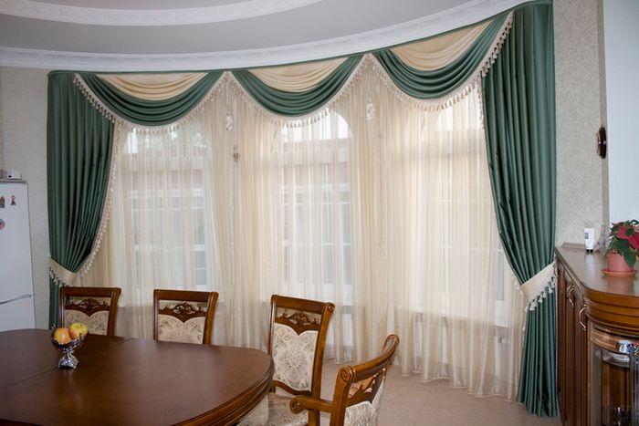 1. Нужно учитывать размеры комнаты, окон, высоту потолков. Не стоит покупать ламбрекены в дом с низкими потолками, лучше выбирать однотонные шторы. Если потолки высокие, а окна большие, их выгодно украсят длинные модели со сборками. Карниз, плотно установленный от стены до стены, визуально расширит комнату, а шторы с вертикальными полосами сделают потолок выше.