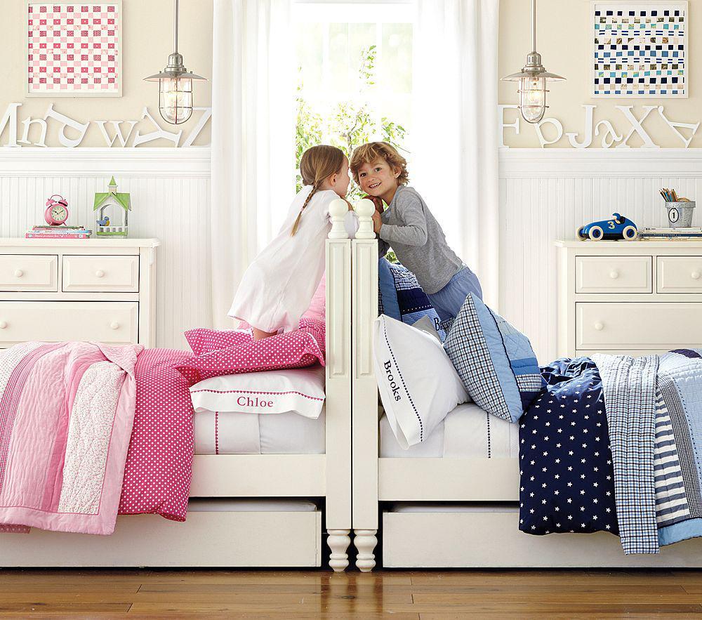При оборудовании личных зон кровати для каждого ребенка обычно устанавливают вдоль параллельных или смежных стен. Если кровати располагают у одной стены, то их разделяют импровизированной перегородкой: стеллажом, комодом, тумбой.