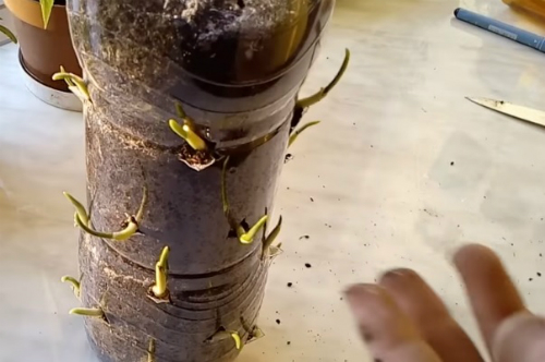 Отделим зубчики чеснока от головки, они должны быть здоровыми, твердыми, без пятен и плесени. Для посадки подойдет любая для вас удобная емкость, не ниже 10 см. Это может быть цветочный горшок, разрезанная вдоль пластиковая бутылка либо бутылка с проделанными отверстиями по всей основе, как показано на фото. В специализированном магазине можно купить грунт универсальный или обычную почву, но обязательно удобренную, можно перемешать с пеплом.