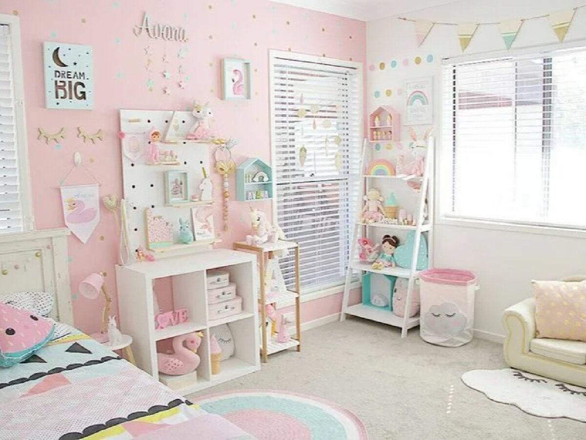 ● розовая стена…? Ее необязательно красить в интенсивный цвет! Выбирайте пастельные оттенки. Мятный и синий будут работать так же хорошо.