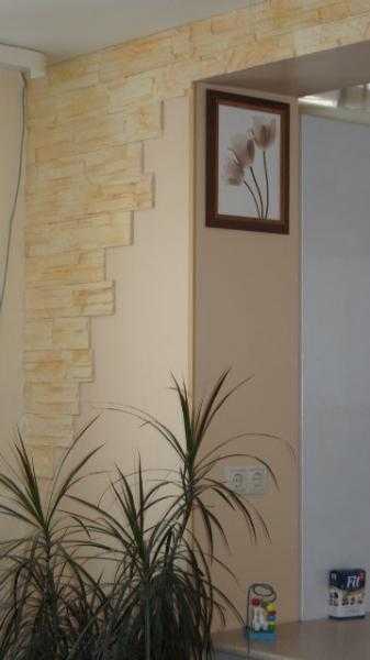 Так как каменные обои имеют незначительную толщину, то углы выкладываются без применения каких-либо угловых элементов. Например, можно укладывать плитку внахлест и все выглядит вполне прилично.