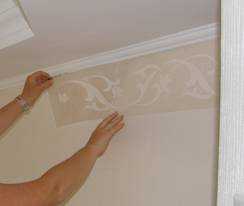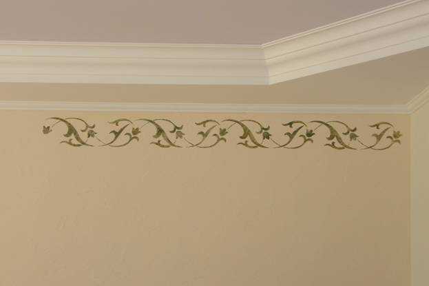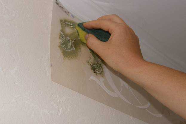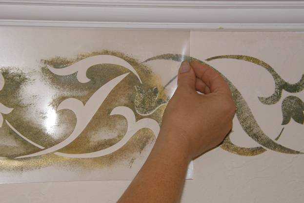 Если вы будете наносить орнамент по периметру стены или потолка, то с помощью линейки и карандаша нужно предварительно наметить его расположение. Готовый трафарет крепим на стену с помощью скотча на бумажной основе. Но сделать это надо хорошо, особенно внутренние элементы трафарета, чтобы исключить затекание краски.