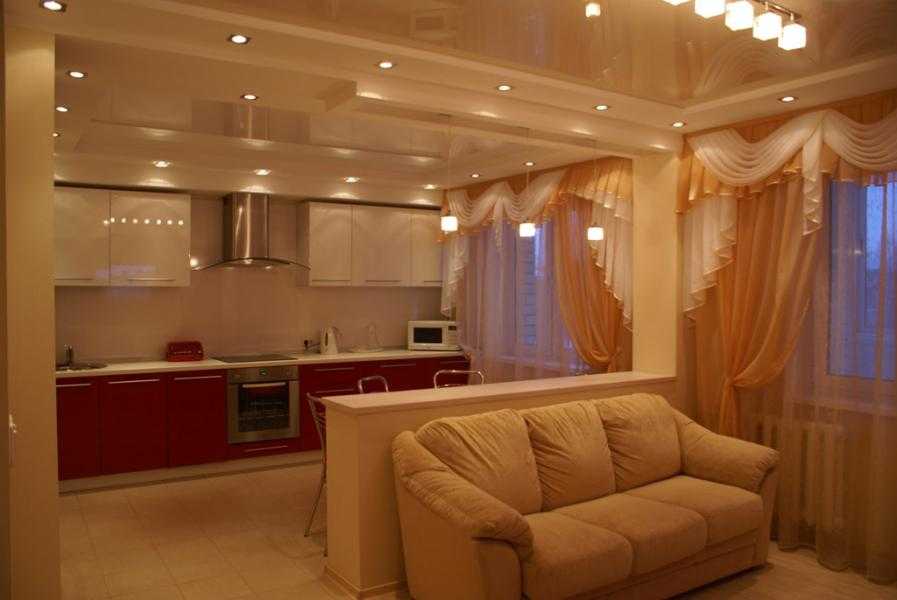 При этом нужно знать, что для кухонной зоны лучше отвести немного места (максимум — треть комнаты), а остальное пространство оставить для зоны отдыха.