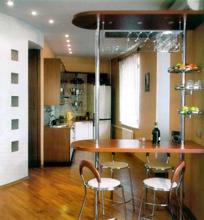 Чтобы визуально разделить эти зоны, можно использовать такой дизайн интерьера, как разный уровень потолка, пола, цвет обоев, барную стойку, перегородку из гипсокартона, цветных или прозрачных стеклоблоков. А чтобы перегородка не перегружала пространство, она должна быть не выше 1 метра.