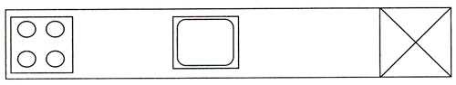 Однорядная планировка: предполагает длину общей рабочей поверхности не более 366 см, иначе расстояние между рабочими центрами будет слишком большим. Поэтому, в таком случае холодильник должен располагаться на одном конце ряда, плита — на другом, а мойка — между ними. Большую часть рабочей поверхности кухни нужно располагать между плитой и раковиной (рис.).