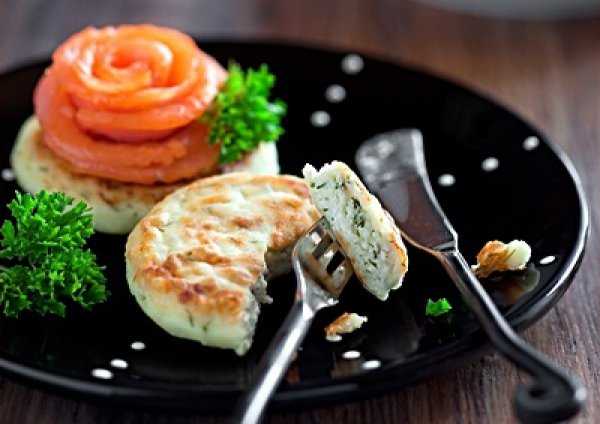 Творог размять вилкой, добавить яйцо, измельченную зелень, муку, соль, перец и перемешать. Мокрыми руками сформировать шарики, обвалять их в муке, сформировать сырники и жарить на растительном масле до румяной корочки. После жарки нужно выложить их на бумажные полотенца, чтобы избавиться от лишнего масла. Подавать теплыми, хорошо со сметаной и копченым лососем.