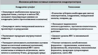 В состав хондропротекторов включены активные и вспомогательные вещества. В активной группе глюкозамин и хондроитин сульфат, к вспомогательным веществам относятся гиалуроновая кислота и сера.