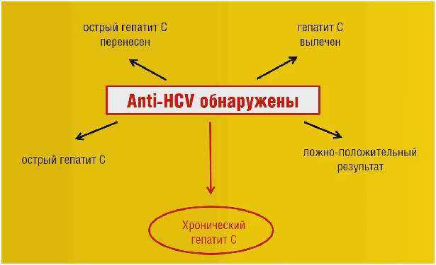 · при одновременном выявлении IgM и IgG обозначается, что произошло заражение HCV; возможен вариант перенесенной бессимптомной инфекции; проведена противовирусная терапия; результат носит ложноположительный характер.