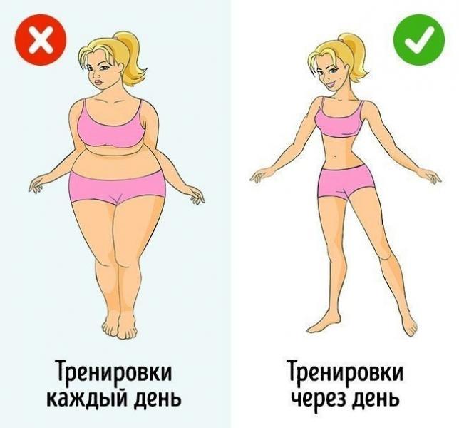 Регулярные тренировки не значит, что они должны быть ежедневные. В этом случае вас ждет постоянная усталость, к тому же в организме увеличится уровень гормона кортизола, который может привести к набору лишнего веса.