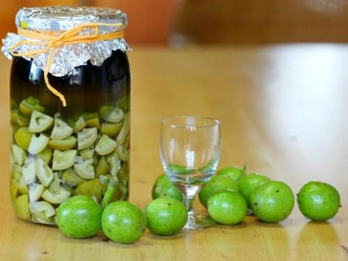 Недозрелые орехи делим на 4 части и плотно укладываем в банку, периодически встряхивая содержимое. Заполняем сырьем треть емкости. Далее все заливаем водкой до самого верха. Ореховую смесь выдерживаем в течение 2 недель, в темном местечке, не забывая время от времени взбалтывать. После выдержанного срока содержимое процеживаем. Принимать настой нужно: взрослым – по 1 ст. ложке, 3 раза в сутки. Детям – по 1 ч. ложке, 2 раза в день.