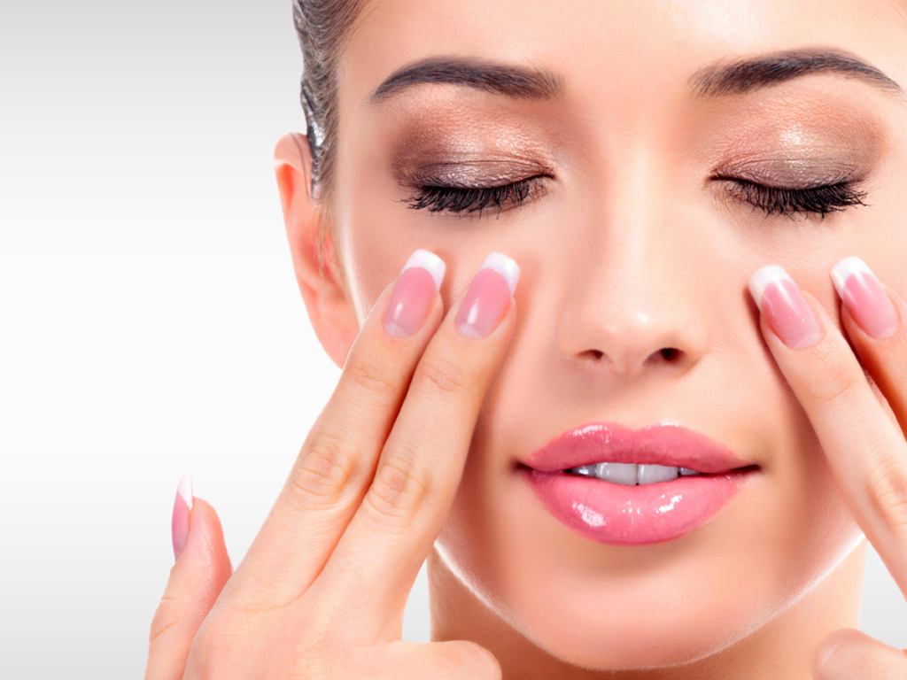 - Средним и безымянным пальцами массируйте вокруг глаз круговыми движениями от центра лба к вискам и обратно к носу.