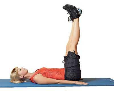 - Лягте на спину, руки положите под голову, ноги поднимите перпендикулярно полу. Резкими движениями сводите и разводите ноги в стороны - 40 раз.