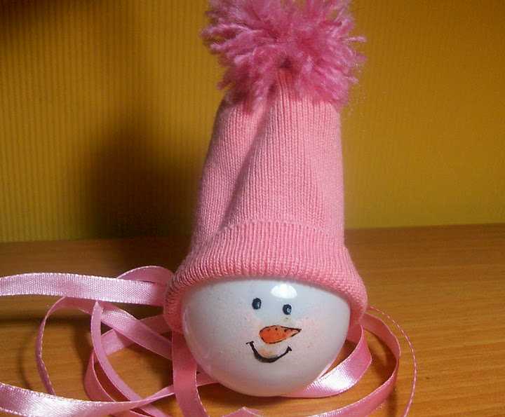 Сначала нарисуем снеговику масляными красками небольшой румянец, затем глазки, нос-морковку, ротик. Колпачок можно сделать из старой трикотажной кофты или свитера — отрезать часть рукава с манжетом и пришить помпончик (как его сделать, смотрите здесь ). К помпончику пришиваем петельку, чтобы снеговичка можно было повесить на елку.