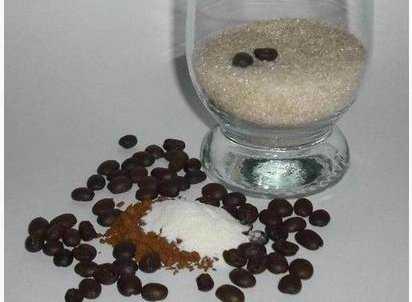1. Для заполнения бокала используем сахар, сливки (сухие), кофе гранулированный и в зернах. Но прежде чем насыпать ингредиенты, приклеиваем перпендикулярно дну емкости заготовленную палочку. А теперь насыпаем слоями в стеклянную емкость последовательно сахар, гранулированный кофе, сухие сливки. У нас получилось по одному слою, но можно количество слоев увеличить, уменьшив их высоту или если емкость выше, то и слоев у вас будет больше. Сверху насыпаем зерна кофе.
