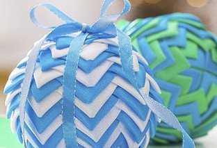 Приложите кусочек, например, синей ленточки к мячику и приколите ее булавками или приклейте.