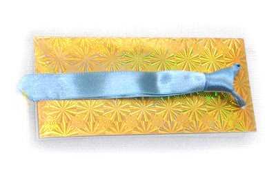 Подбираем подходящую ленту, затягиваем ее в отверстие и завязываем в форме галстука (как завязать узел можно посмотреть здесь ), который фиксируем двухсторонним скотчем на открытке.