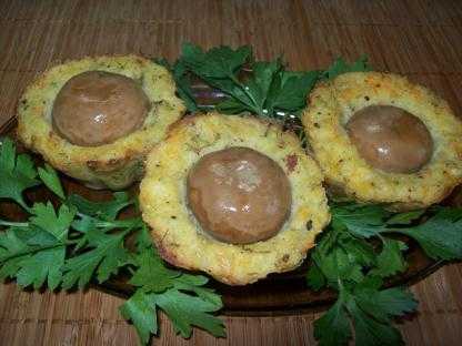 Ингредиенты: картофельное пюре (вчерашнее) — 500 г, плавленный сырок — 1 шт. (на терке), яйцо — 1 шт., сырая морковь — 1 шт. (на мелкой терке), манка — 2 ст. л., несколько шампиньонов (по количеству кексов), мелко порезанный укроп, сухой базилик и розмарин, перец и соль по вкусу.