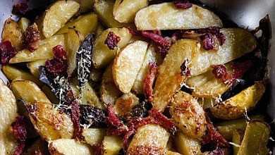 Ингредиенты на 6 порций: 1,5 кг картофеля, 500 г бекона (нарезать полосками шириной около 1,5 см), 2 головки красного лука, 6 зубчиков чеснока, 150 мл сметаны, 50 г твердого сыра, 1 столовая ложка оливкового масла, свежемолотый черный перец по вкусу.
