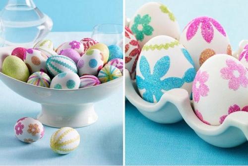 Пасхальные яйца могут быть не только крашенными, но и декорированными, причем множеством разнообразных способов. Конечно, в этом случае в дело вступают клей, нитки, лаки и прочие несъедобные материалы, поэтому выставлять такие пасхальные яйца на стол можно только в качестве декоративных композиций.