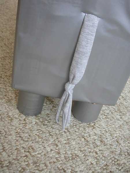 4. Отрежь от футболки рукав и приклей слонику хобот. Кроме рукава вырежи широкую длинную прямоугольную ленту, сложи ее пополам, сшей и в конце сделай узелок - это будущий хвостик слона.