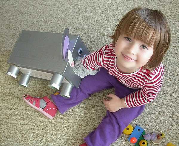 5. Согни картонный лист пополам и вырежи два больших одинаковых овала. Обклей их пленкой. Сбоку каждого овала приклей по одному меньшего размера - розовый. Частично просунь их в прорези для ушей и приклей. Из белого картона изготовь слонику бивни.