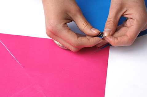 1. Возьмите листок цветной бумаги и вырежьте квадрат. Оптимальный размер стороны 20 см. Прочертите 2 диагонали и найдите центр квадрата. Отступите по 1 см от центра по линиям в сторону каждого из углов, поставьте отметку.