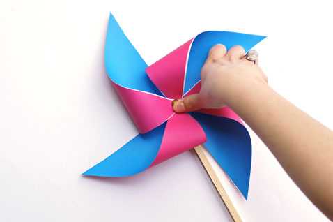 6. Закрепите вертушку гвоздиком. Прикрепите к деревянной палочки. Простейшая вертушка из бумаги, изготовление которой занимает не более пяти минут, принесет ребенку гораздо больше радости, чем купленная в магазине!