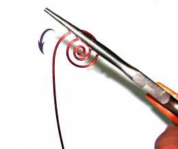 Используйте круглые плоскогубцы, чтобы наматывать проволоку, как показано на изображении. Нужно поймать края проволоки и сделать круглую петлю, которая будет находиться в центре спирали.