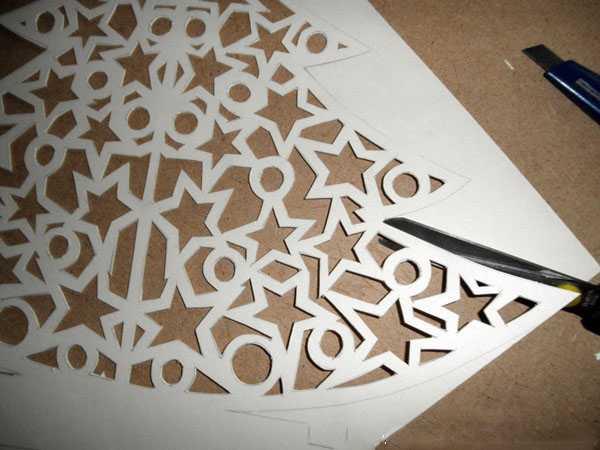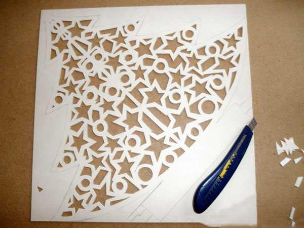 С помощью канцелярского ножа сделай узор на елке — сначала внутри и лишь затем переходи к вырезанию контуров ножницами.
